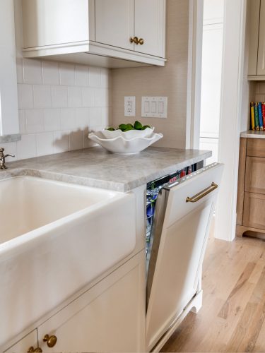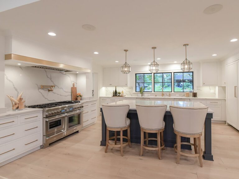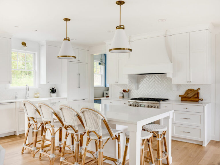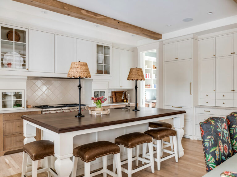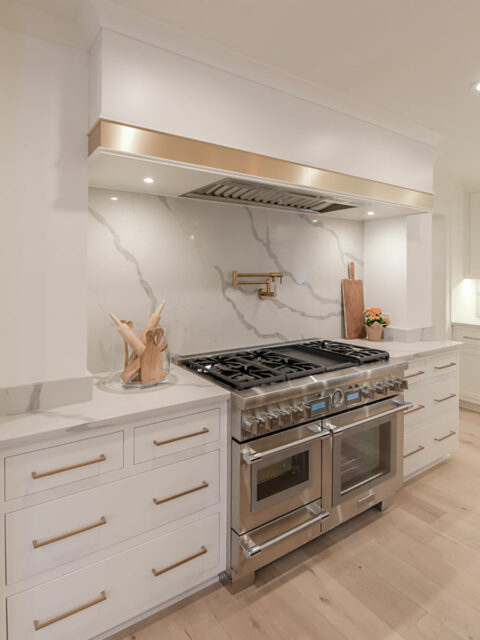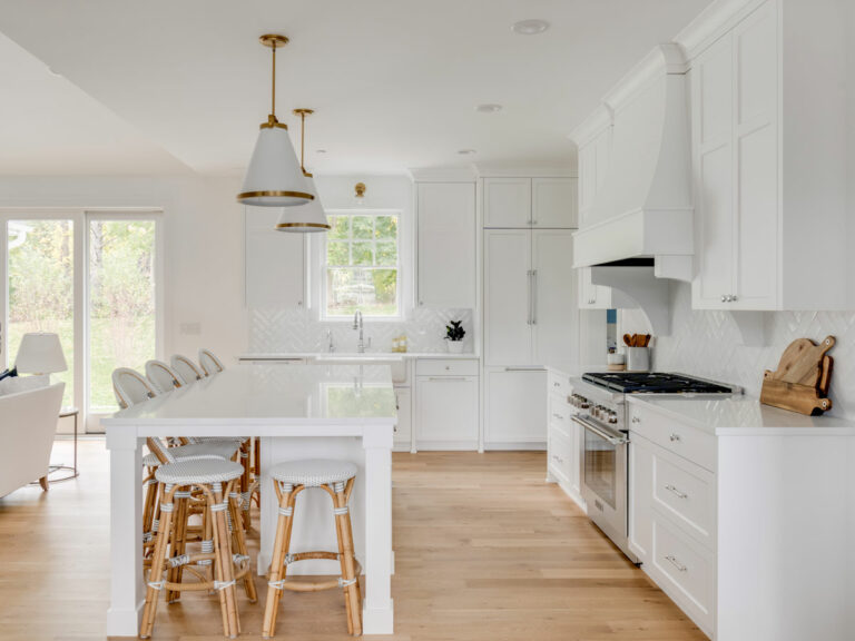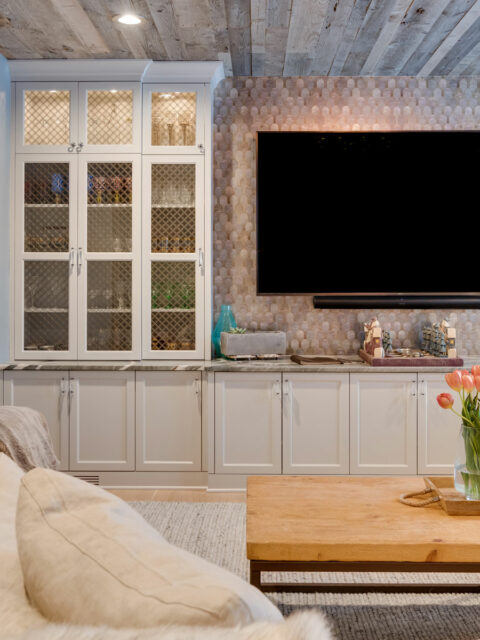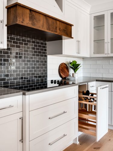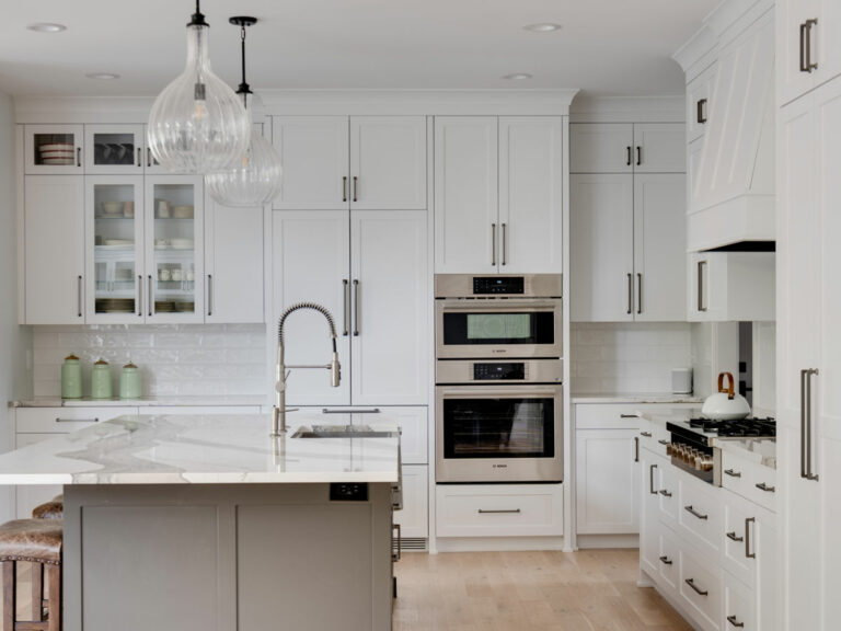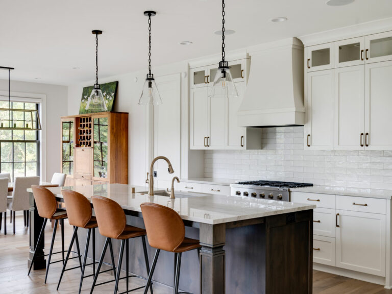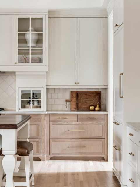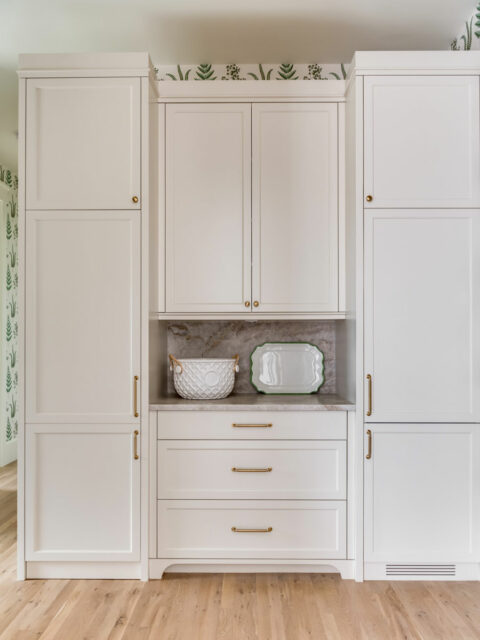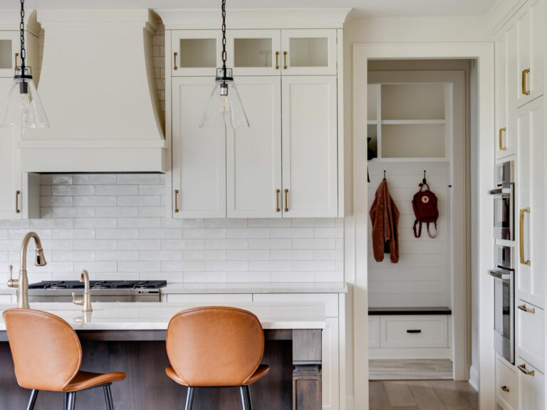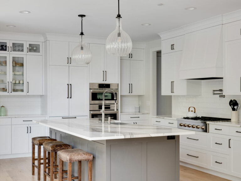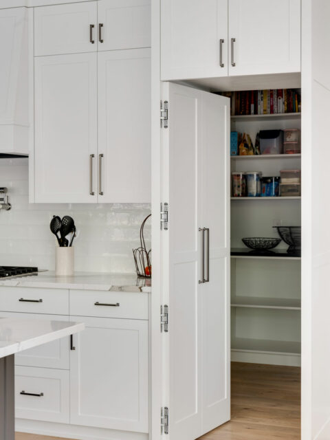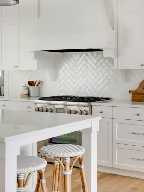 An all-white color scheme allows Sand Creek Cabinetry’s craftsmanship to shine in this elegant kitchen. The custom wood vent hood and expansive island anchor the open-concept space. The wall cabinets are flush with the ceiling to maximize space and trimmed with a modern take on crown molding. Glass panels on the top third of the wall cabinet doors allow the homeowner to showcase their glass serving ware. As with all Sand Creek Cabinetry projects, the custom cabinets feature hardwood construction, slow-close drawers and doors, pullouts, and inset hinges for a clean, classic look.