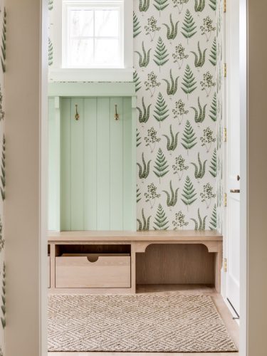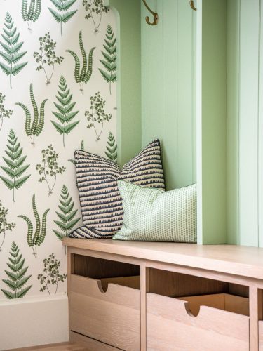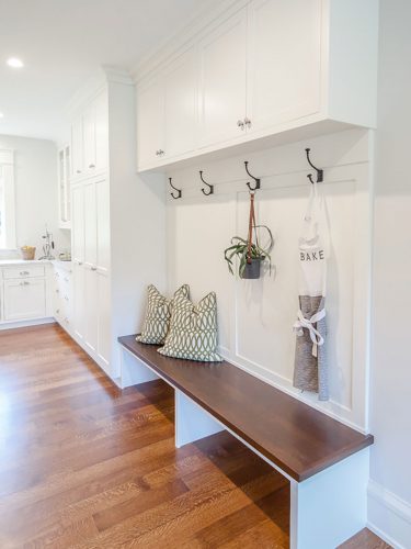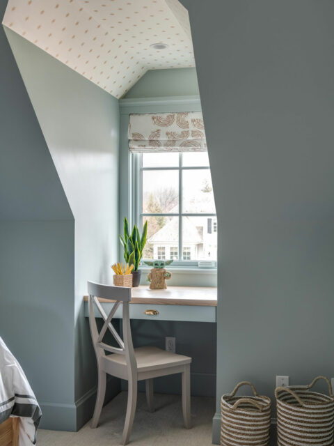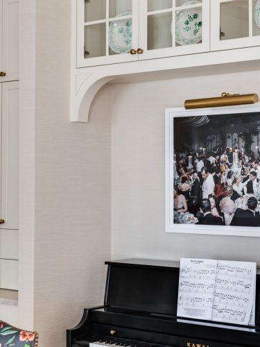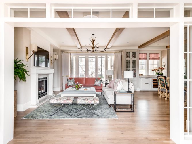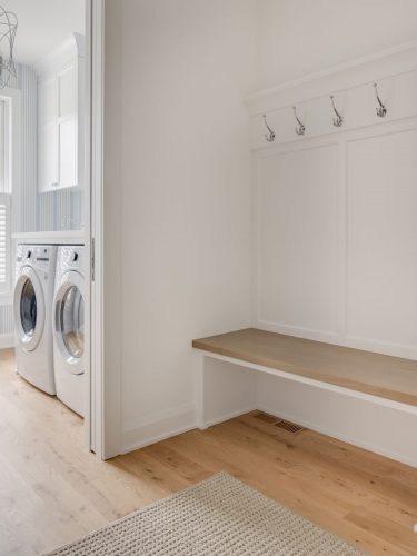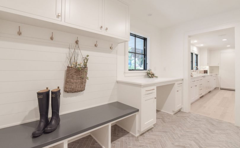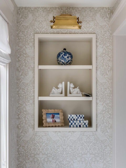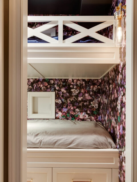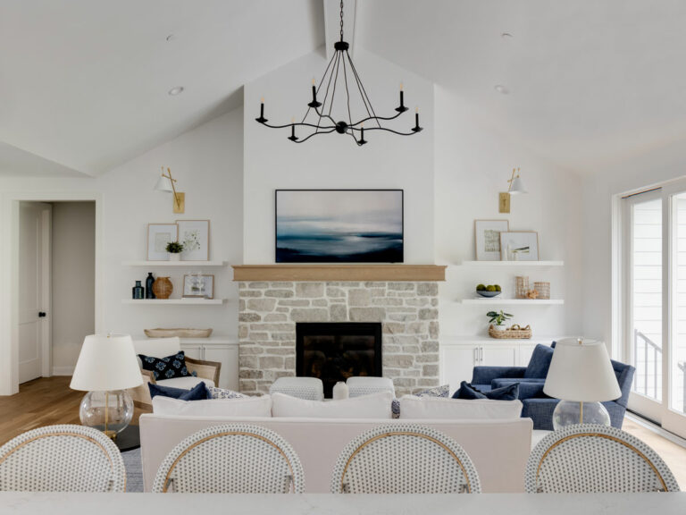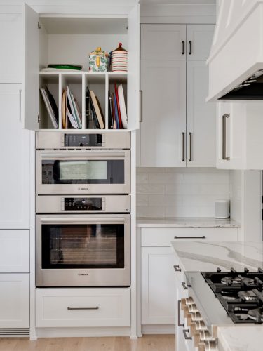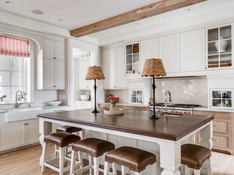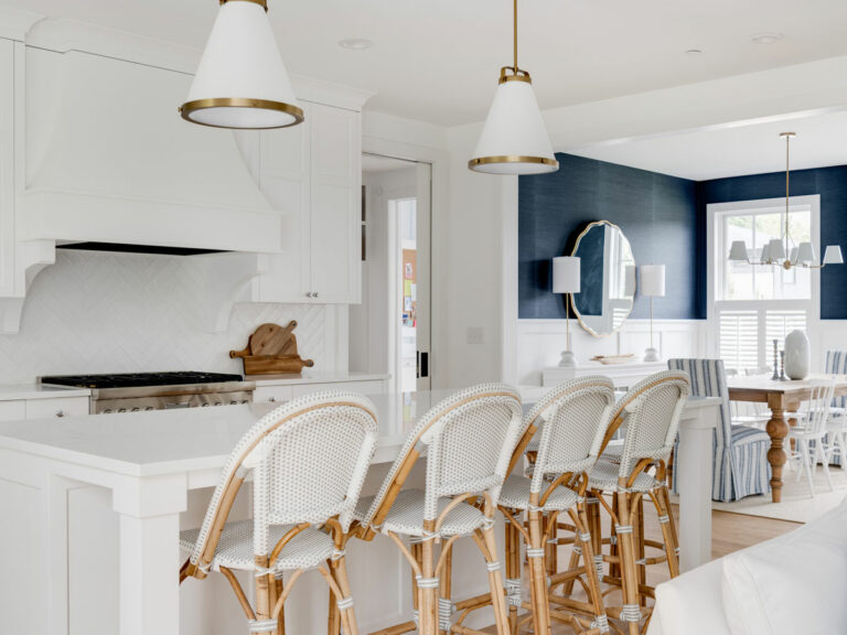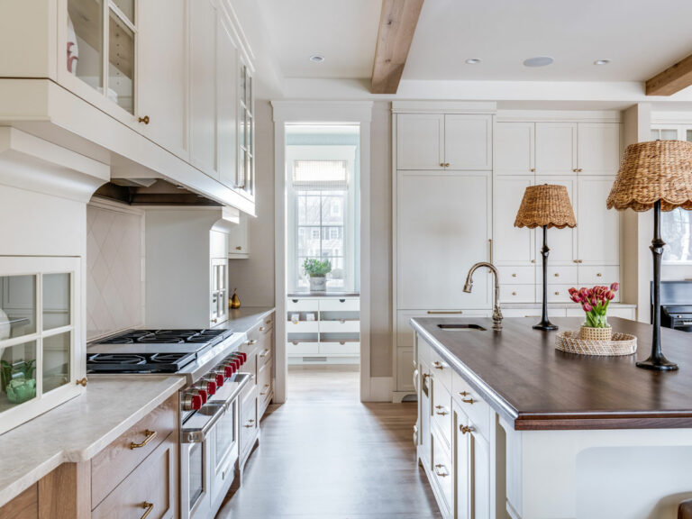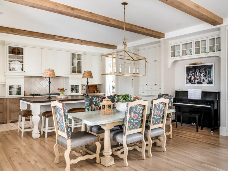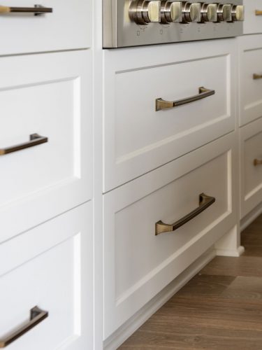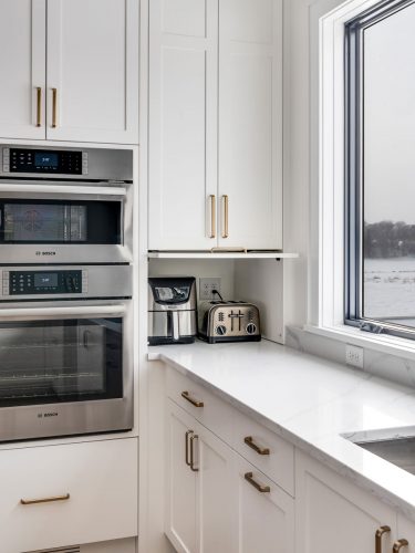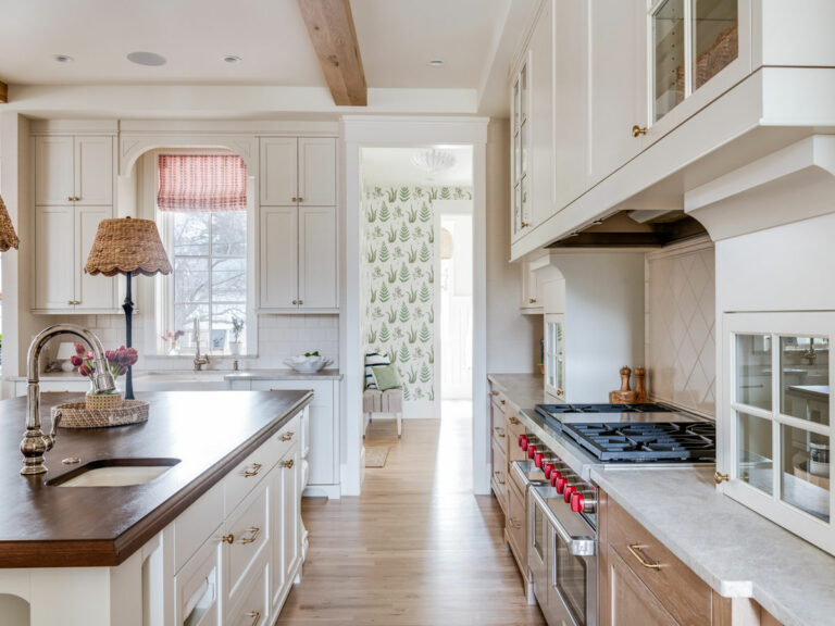 An all-white color scheme allows Sand Creek Cabinetry’s craftsmanship to shine in this elegant kitchen. The custom wood vent hood and expansive island anchor the open-concept space. The wall cabinets are flush with the ceiling to maximize space and trimmed with a modern take on crown molding. Glass panels on the top third of the wall cabinet doors allow the homeowner to showcase their glass serving ware. As with all Sand Creek Cabinetry projects, the custom cabinets feature hardwood construction, slow-close drawers and doors, pullouts, and inset hinges for a clean, classic look.